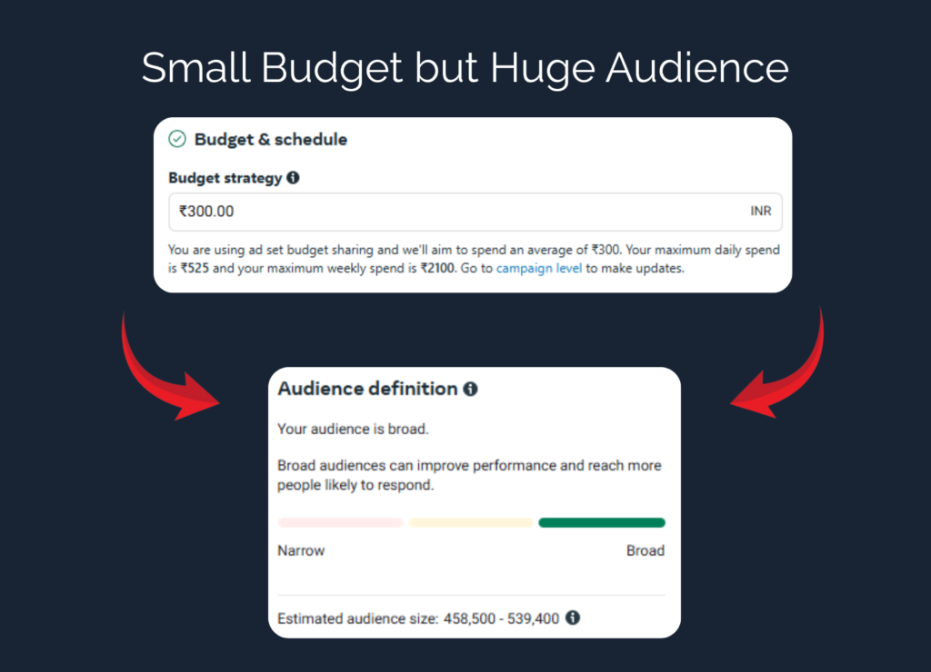 For example, you can start with a daily budget of just ₹300, targeting a specific radius. Meta will automatically estimate the potential audience size, showing both narrow and broad reach indicators to help you set realistic expectations.